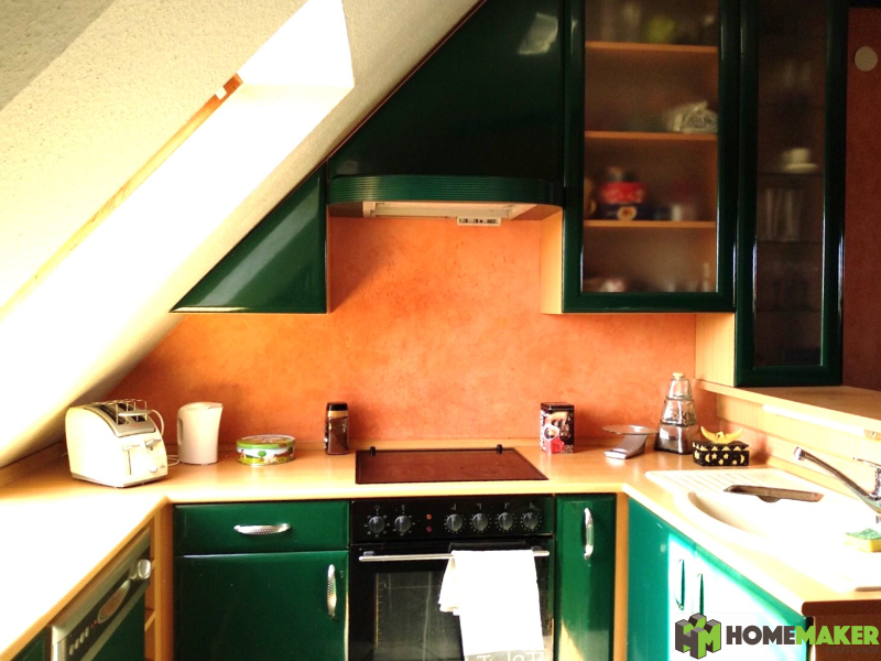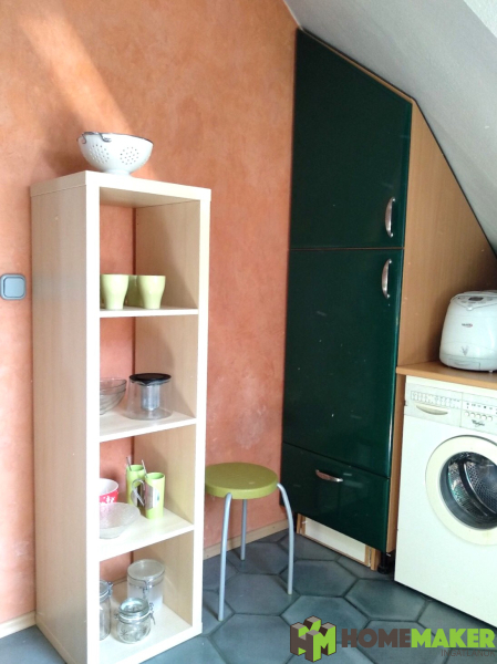 – a kicsit szeparált konyhában rengeteg tárolóhely van és beépített háztartási gépekkel van felszerelve