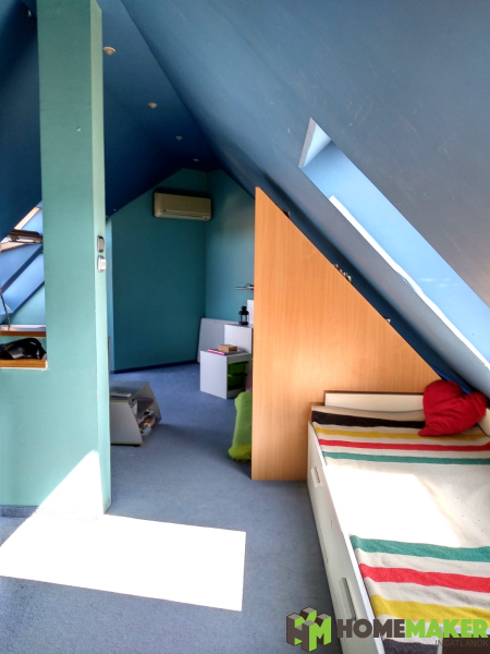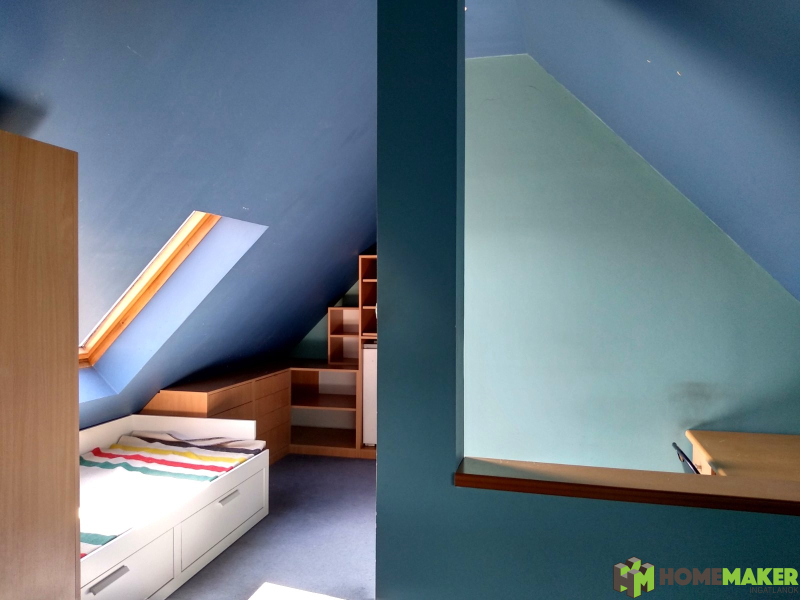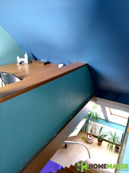 A felső szinten, egy légtérben van még egy hálószoba és harmadik hálószobának leválasztható, most gardróbként funkcionáló helyiség.