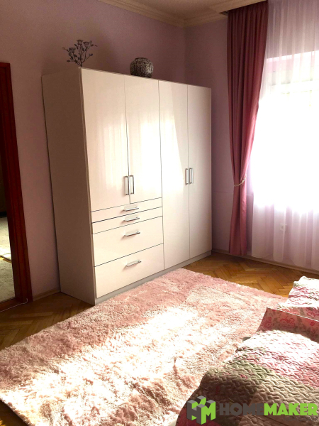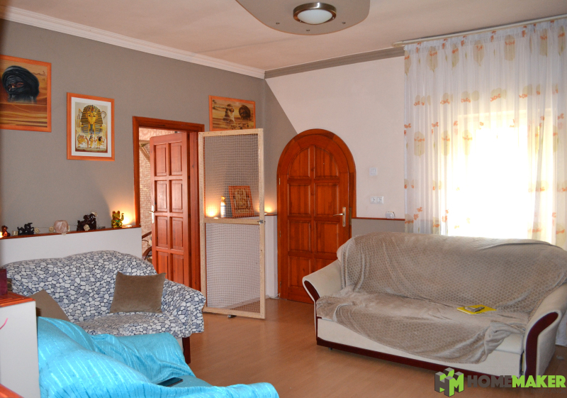 4 szoba + nappali, konyha, kamra, tároló, fürdőszoba + külön WC kézmosóval és egy fedett terasszal.