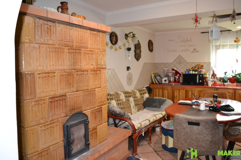 – a szép tágas étkező-konyhában hangulatos cserépkályha melegít