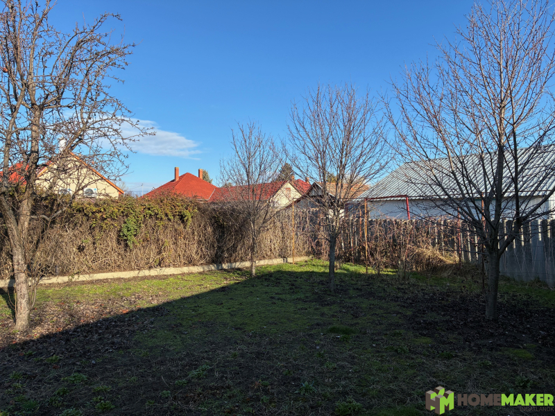 A lekerített kertben termő gyümölcsfák vannak. Fúrt kútról biztosított a veteményes locsolása.